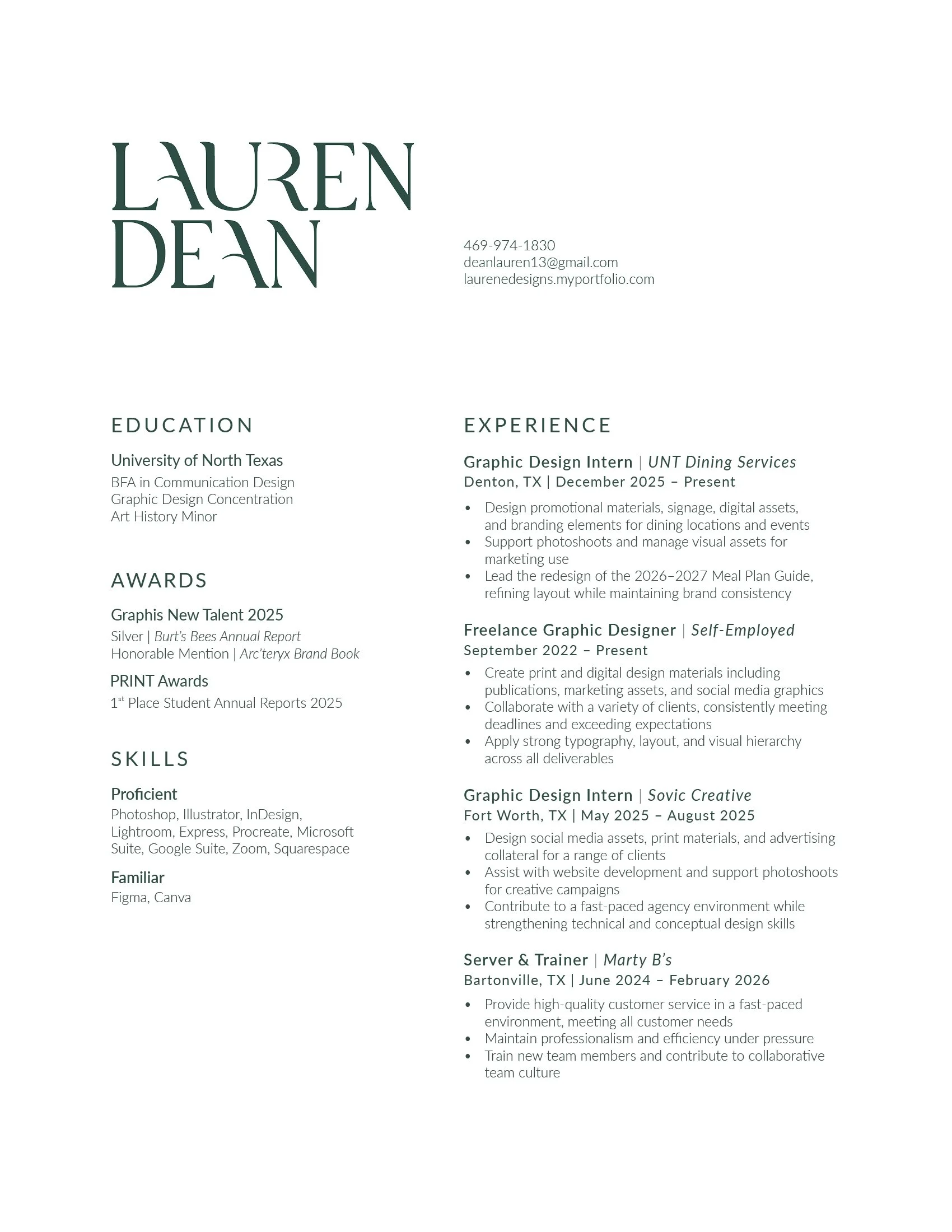 I’m Lauren Dean, a designer based in Dallas, TX. My work is rooted in intentional systems and disciplined design thinking. I prioritize strong typography, structured grids, and clear visual hierarchy to create work that feels refined, cohesive, and purposeful. I’m drawn to projects where clarity and strategy guide every decision, ensuring that visual communication supports both functionality and long-term impact. My work has been recognized by both Graphis and PRINT Magazine.