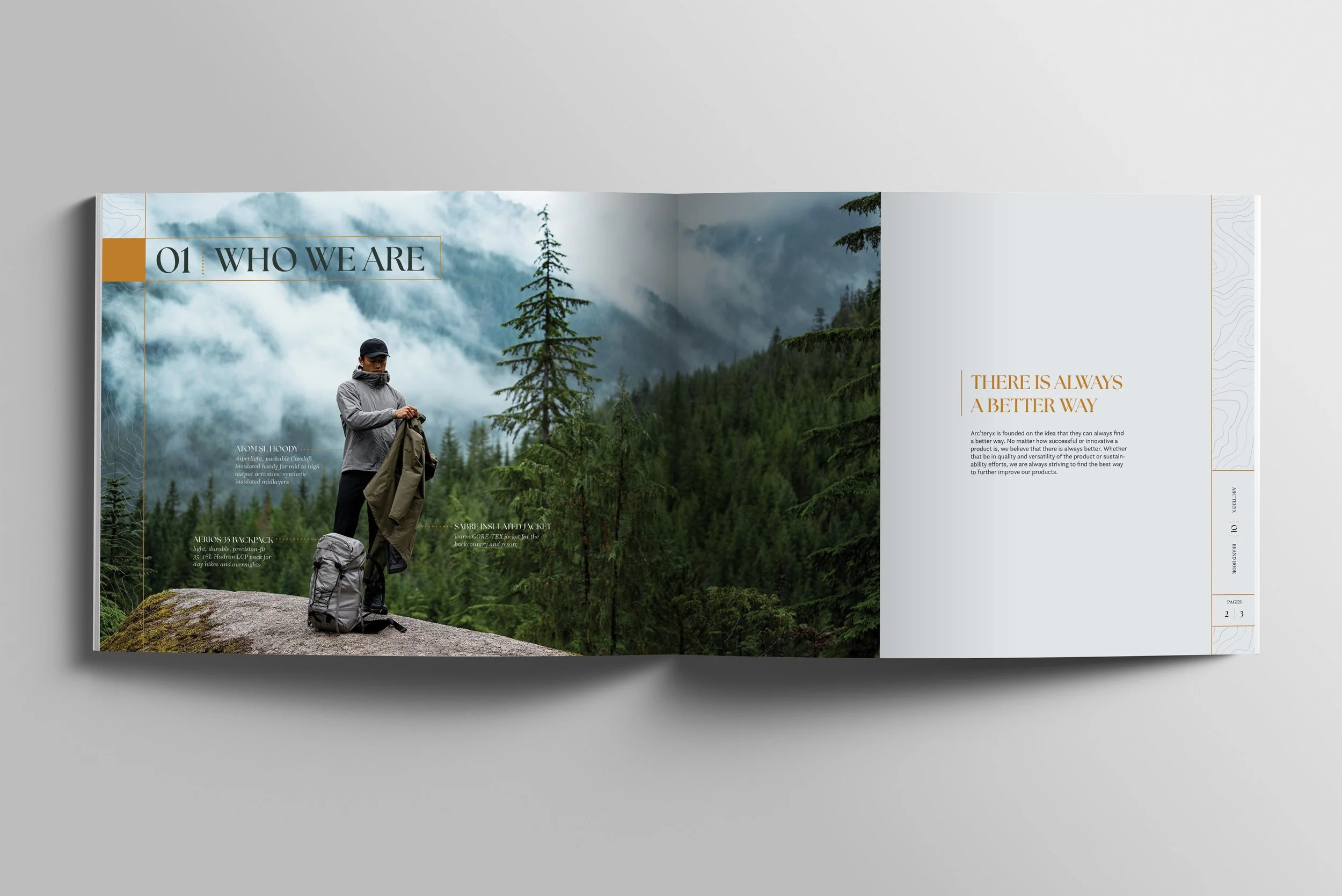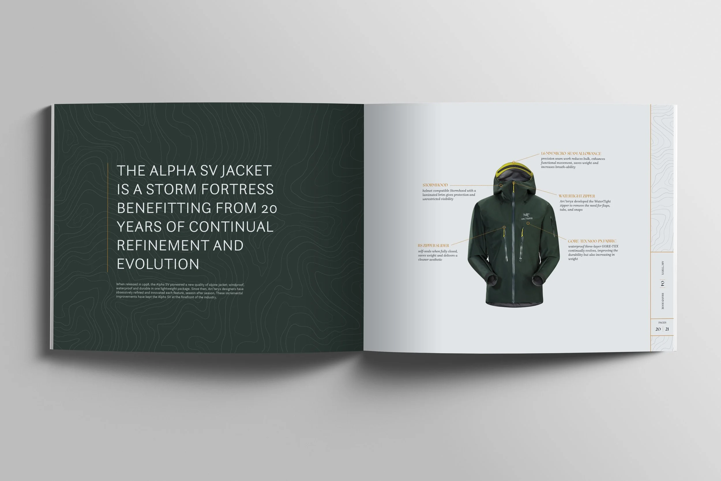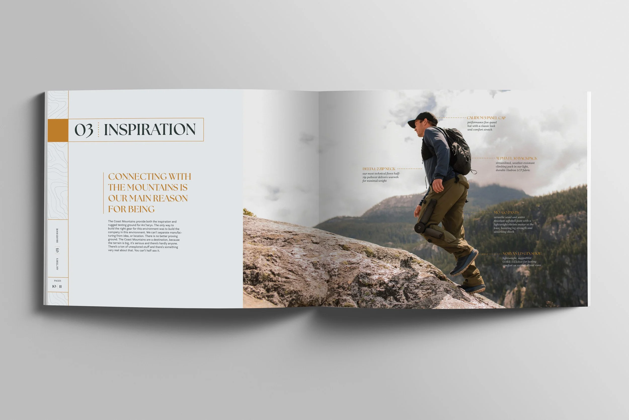 The publication was designed to reflect Arc’teryx’s emphasis on performance and craftsmanship through a disciplined, editorial system. Large-scale imagery showcases products in motion, emphasizing durability and the relationship between design and environment.